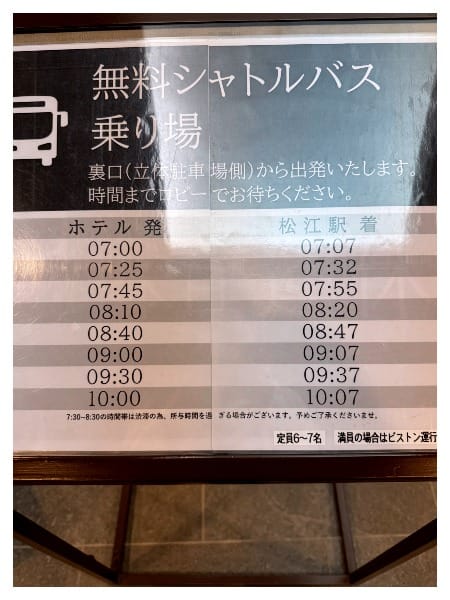一邊發呆一邊吃完早餐後在旅館內閒逛,才突然看到櫃檯有個牌子……我記得昨天應該沒看到這個,走過去看才發現有旅館接駁車,接駁車要跟櫃檯說一聲,櫃檯會算人數。看了一下旅館發車最遲就是十點那班,原先是想說行李要不要寄放在旅館,之後逛完再搭回來,但我發現這樣實在是太不方便了——是的,該馬上去收拾行李準備退房,然後看看來不來得及擠到一個位置。