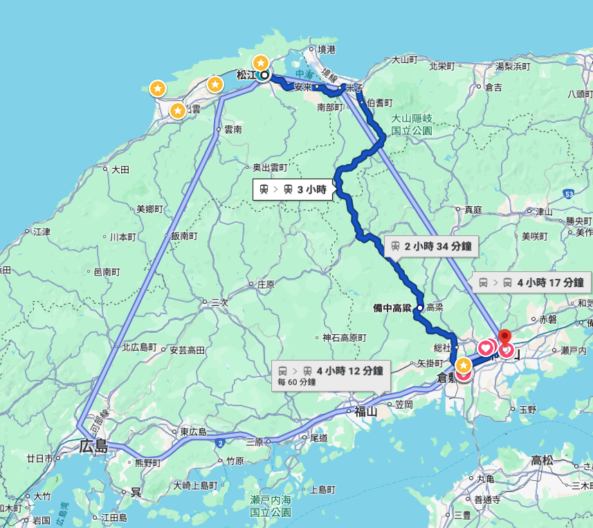 接下來要離開松江,直接往岡山去了。這次搭的也是昨天搭的八雲號,要穿過山,一路往南行駛。搭公車回到松江站後,我在那裡買了一些要在車上吃的東西,還有買了一些伴手禮紀念品,泡在星巴克好一陣子後準備上車。