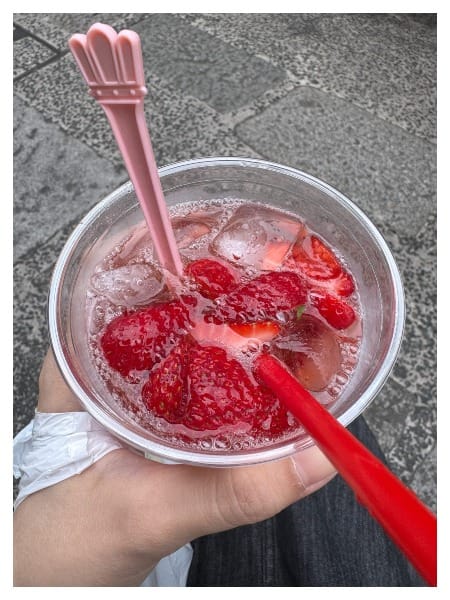 路邊有看到一間在賣草莓的冰飲,其實就蘇打水跟切好的草莓,不過真的很好喝,點完後就直接坐在店門口外面的椅子喝,就有不少人看到就也跑去買XD。但喝完還是覺得體溫幾乎沒有好轉,最後沒有逛完全部的店家,畢竟天氣熱成這樣可能隨時都有中暑危險。