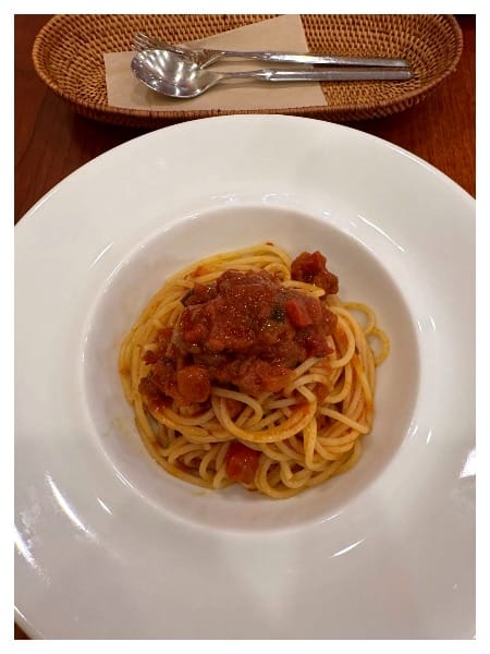 剛好那時候是下午一點,整個倉敷的街區的餐廳都是滿的,我後來路過一間看進去人比較沒那麼滿的義大利麵店,進去後稍等一下子就有位置了,然後看到菜單才發現是純素的義大利麵店。不過跟想像的不一樣,真的很好吃,同時也點了超大杯冰茶來喝,在店裡面休息了好一陣子後,等到全身比較涼一點再出發。