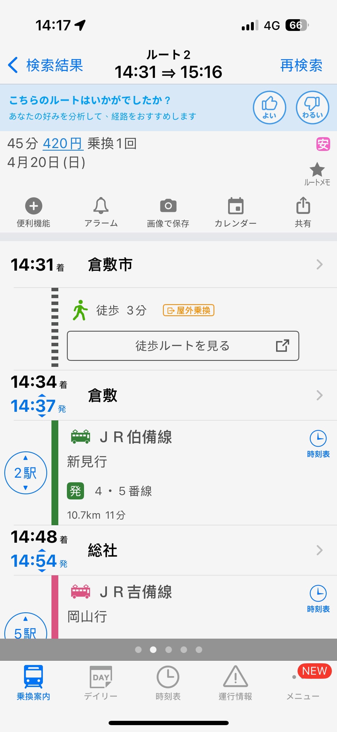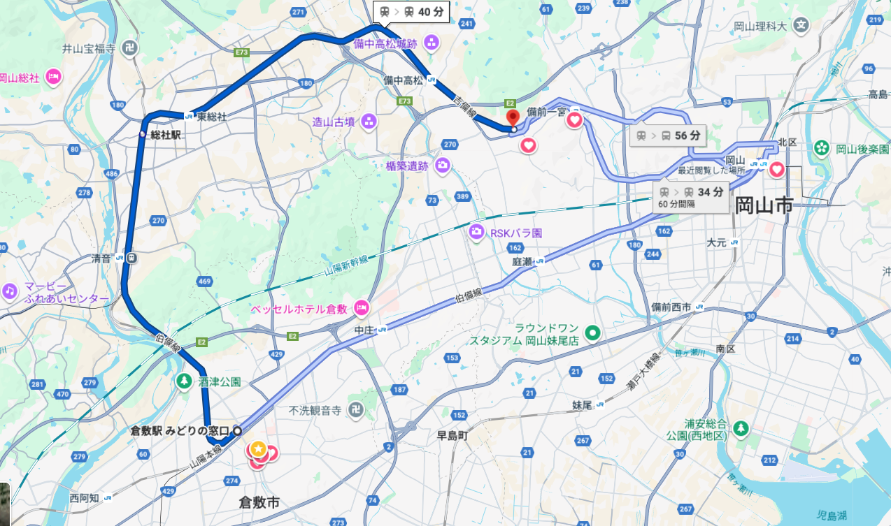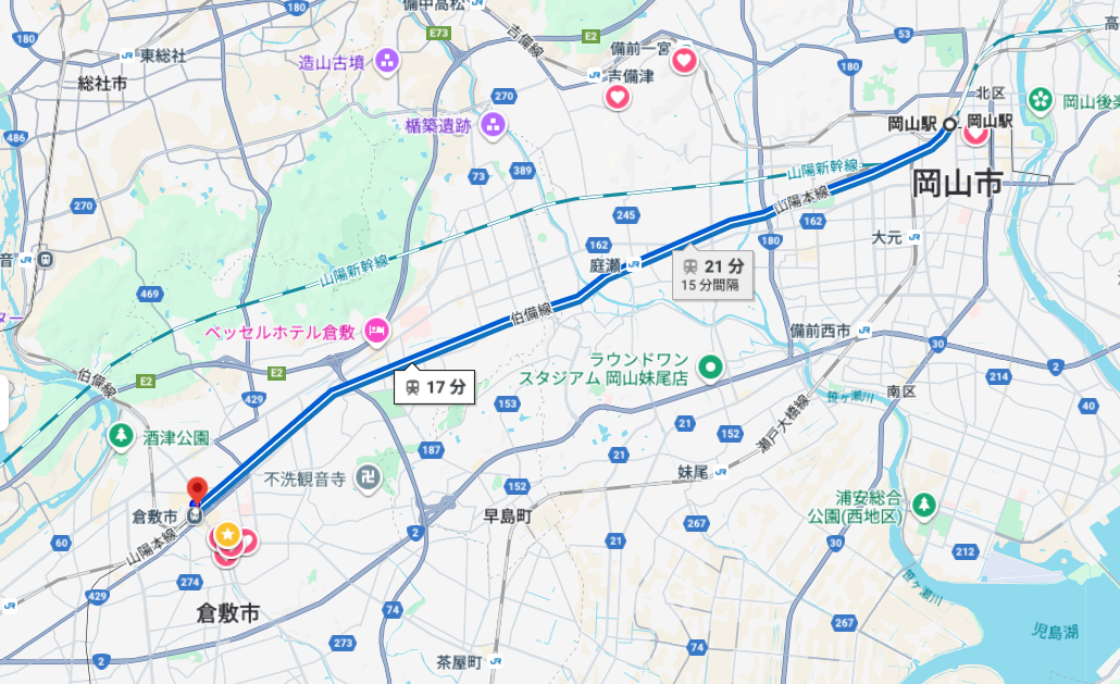 睡前還在猶豫到底要去哪,可能是身體不舒服讓行程整個大亂後,我之後整個放飛,打開Google Map開始評估到底是要去逛哪,最後決定先搭車到隔壁的倉敷市好了。隔天我直接睡到自然醒,吃完早餐後準備走去車站,搭車前往倉敷。