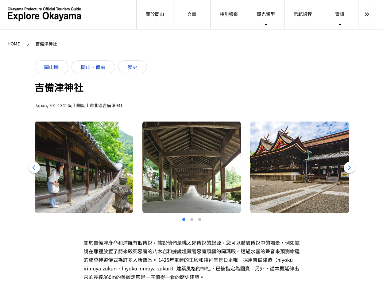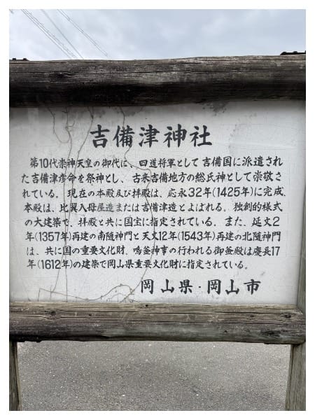 看了一下其他網站的介紹,有提到這裡是桃太郎傳說的起源,而吉備津神社(備中國)跟附近的吉備津彥神社(備前國)都是祀奉一樣的主神,以前古代是分成不同的國家,所以才會有兩個名字很像的神社在附近。