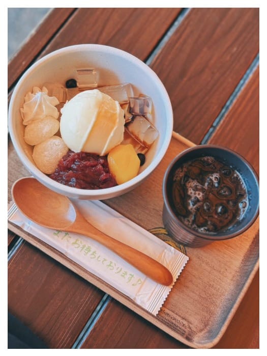 由於時間越來越接近正午,在感覺差不多快被曬乾時,剛好看到有一間茶屋,就進去點了冰品,坐在陰涼處一邊吃一邊看人來人往的路人。這時間點吃茶點感覺就太早了,但我的靈魂告訴我要吃就趁現在!
