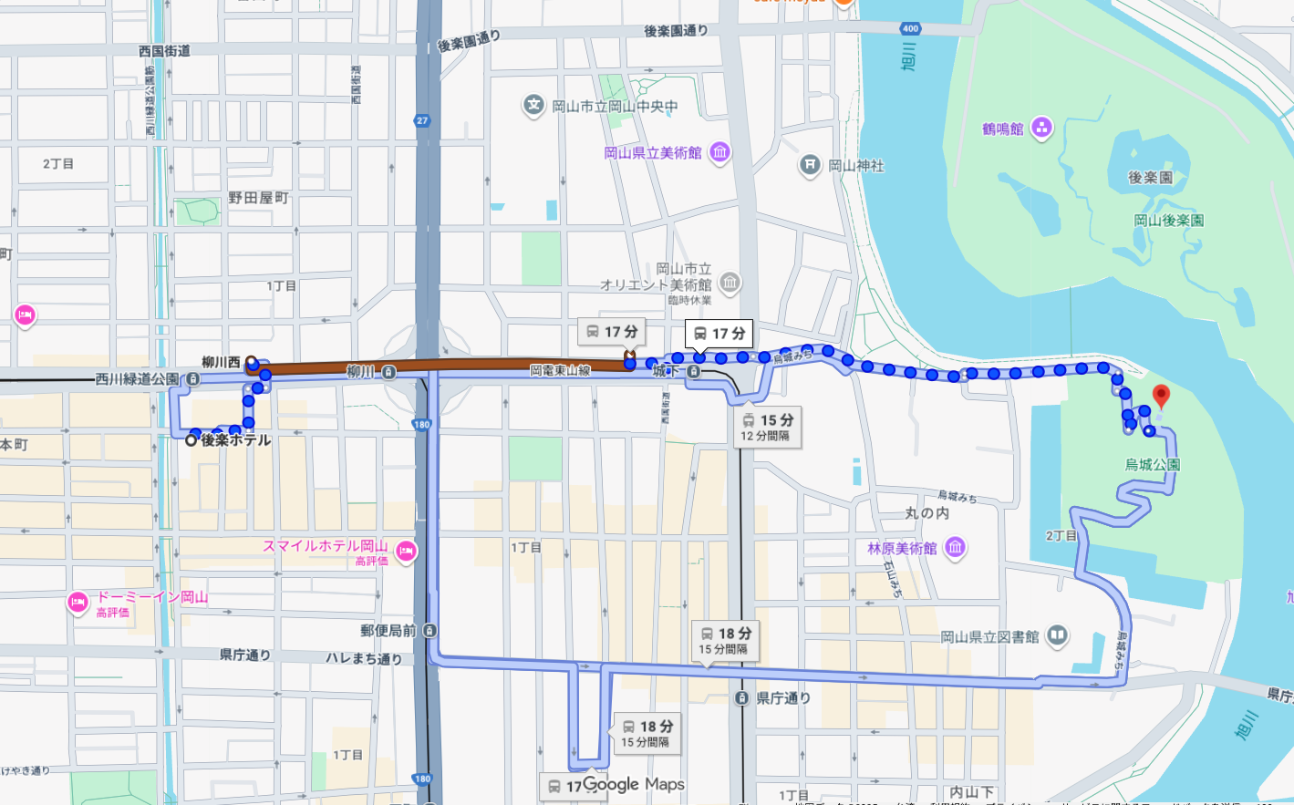 從旅館走出來後就是路面電車的上站地點,搭東山線到城下站下車,接下來就可以前往烏城公園了。