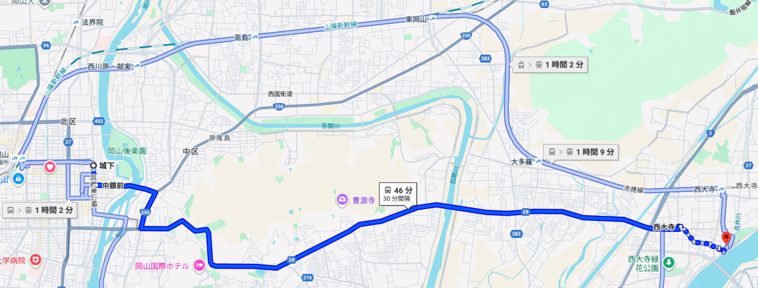不過時間尚早,我回去剛剛來的城下站地下噴水池上個廁所,重新投了一罐冷飲,坐著開始查還可以去哪。後來就看到地圖有個叫做西大寺的地方,我可以搭公車抵達,想想在松江搭公車我也搭得很開心,這次何不搭遠一點的站試試看?