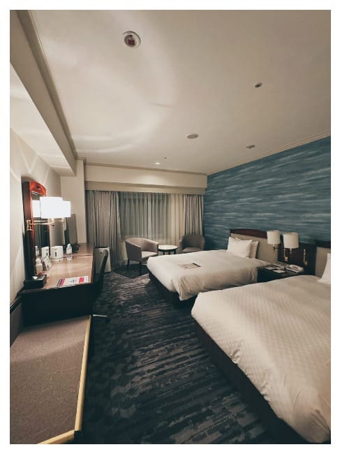 怎麼會有兩張床……不過真的是超大,晚上要整理行李也很方便(然而我已經前一晚就在岡山都整理完了,完全不需要整理XD)。check in完時間也差不多快晚上九點,就趕快先去機場裡面找吃的,而這時候在機場就真的很方便,餐廳也沒什麼人,而且超商跟藥妝店都有,感覺如果沿途忘記買紀念品的人,也能在機場買齊所有的東西XD