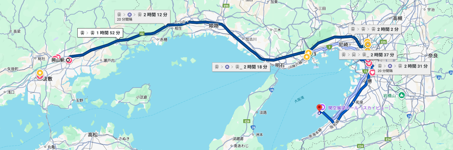 所以最後我改成最後一晚直接住在關西機場的日航飯店,這樣隔天我可以悠閒地睡飽再晃過去搭飛機。飛機起飛時間是11點半,也就是說9點半我就要抵達。假設我是從神戶出發到神戶機場我就得要7點就開始準備(即便我是住在大阪市區也是一樣要很早出發,所以最後一晚完全不考慮住市區),這樣的改動至少可以讓最後一天比較輕鬆一些,而且還可以在岡山慢慢晃。