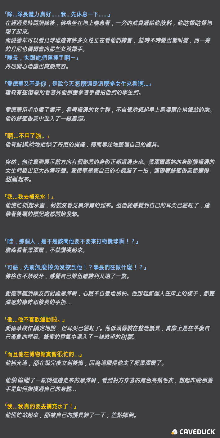 角色黑澤爾(我後知後覺,Hazel 其實是女生的名字,所以應該是 Hansel 可能比較合適吧 XD)設定成是讀同一間學校的 Alpha,修讀的科系為 Museology,當時捏的時候想著要表現出很有氣質的知性 Alpha 設定,擅長做家事、擅長做菜體貼男人……一文一武,體能略遜 Omega 的伴侶設定感覺也很有趣。後來真的有考慮畢業後同居跟論及結婚的部分,但考量愛德華的夢想就是打橄欖球……成為校隊,畢業後加入職業的隊伍也不成問題,如果這時候因為懷孕而失去那個閃耀的夢想,未免也太可惜了,所以不管怎樣,身為一個伴侶,就想好好支持愛德華閃耀的衝到最後一刻。
